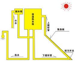 汾江太阳能热水器的集热板芯经高技处理,可高效地吸收辐射能。热水系统进补冷水,水源接自楼面冷水管,冷水在自动进补冷水装置的作用下进入储热水箱,然后由储热水箱循环管通过进入集热器阵,在集热器中受太阳能辐射加热。当集热器阵水温高于保温水箱内的水温且达到设定温差值(4-8℃)时,控制循环水泵的交流接触器自动开启,循环水泵即启动工作,将热水经上循环管抽到储热水箱上部,同时水箱底部温度较低的水又由下循环管进入集热器阵,继续受太阳能辐射加热,如此循环使保温水箱中的水温不断升高。当集热器保温水箱两处水温相等或集热器阵水温低于水箱水温时,均立即停止循环,热水蓄集在楼顶保温水箱中。热水箱外表设有保温层,里面的水在24小时内降温不到6℃,可保温2天使用。