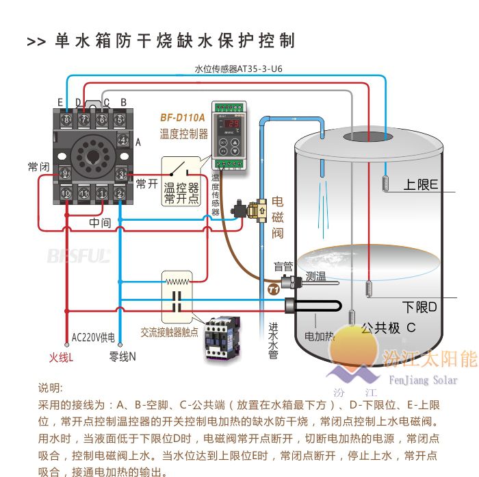 共A,B,C,D,E五个水位探极信号输入: A为上水箱的上限位输入; B为上水箱的下限位输入; C为公共极; D为下水箱的下限位输入; E为下水箱的上限位输入 |