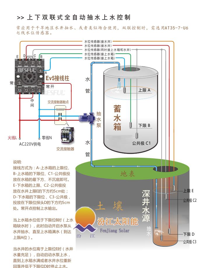 1. 上水箱、下水井场合的双联智能控制,实现无人值守的自动抽水、补水控制,当上用水水箱缺水时自动从水井抽水补水,或当下方水井、水池满水时,就自动抽水到上水箱内蓄水。