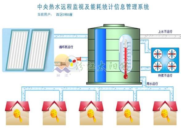 根据部分使用中央热水系统的单位的需要,我公司开发了中央热水远程监视与能耗统计信息管理系统。 经过在一些单位的使用,中央热水远程监视与能耗统计信息管理系统,性能稳定、安全可靠、操作方便、省工省时,在有网络的任何地方,都能掌握、了解热水系统运行状态和耗能情况。 该系统对中央热水系统进行时时监视,及时发现故障,立即排除,保障热水供应。该系统能自动按年、月、日统计每个热水系统的用水量、用电量、每吨热水的耗电量等,可根据热水系统用水情况进行调整,达到节能的目的。 中央热水远程监视与能耗统计信息管理系统具十二个功能: A、时时监视功能 1、监视太阳能循环泵运行情况。 2、监视热泵运行情况。 3、监视热水系统的水量情况。 4、监视热水系统的水温情况。 5、监视热水系统的进水情况。 6、监视热水系统的用热水情况。 B、保存热水系统运行的历史记录 7、每小时记录一次循环泵、热泵、进水、用水、水位、水温等运行情况。 8、每天记录二十四次。 9、记录保持二年。 C、自动统计热水用量、用电量 10、每天定时统计当天的热水用量、用电量、每吨热水平均耗电量。 11、按月自动统计热水用量、用电量、每吨热水月平均耗电量。 12、按年自动统计热水用量、用电量、每吨热水年平均耗电量。